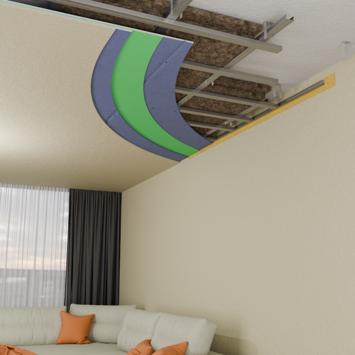 В основе системы «ПРО-УЛЬТРА» лежит многослойный подход, где каждый компонент выполняет строго определенную функцию в общей системе звукоизоляции. Минеральная плита толщиной 100 мм обеспечивает превосходное звукопоглощение. Её эффективность усиливается применением виброизолирующих подвесов, которые гасят структурные шумы, предотвращая их передачу через конструкцию. Звукоизоляционная мембрана выступает надежным барьером против воздушных шумов.