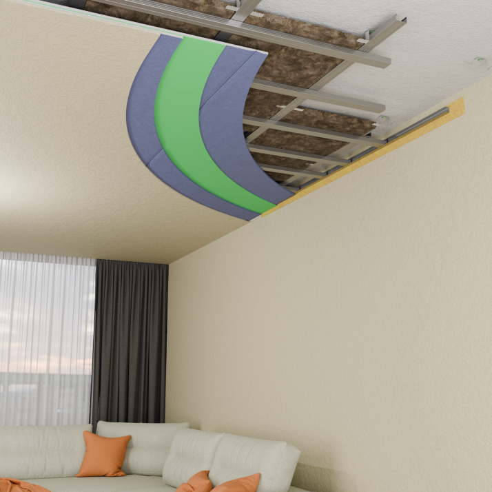 Система «КОМФОРТ-УЛЬТРА» обеспечивает многоуровневую защиту от шума благодаря интеграции свойственных каждому материалу качеств в единую эффективную систему акустической изоляции потолка. Виброизолирующий подвес снижает передачу ударного шума через конструкцию. Мембрана повышает звукоизоляцию за счет своей массы, лента и герметик обеспечивают герметичность системы на стыках и соединениях, что предотвращает утечки звука. Гипсокартон вместе с профилями формирует устойчивую основу для монтажа всех компонентов конструкции.